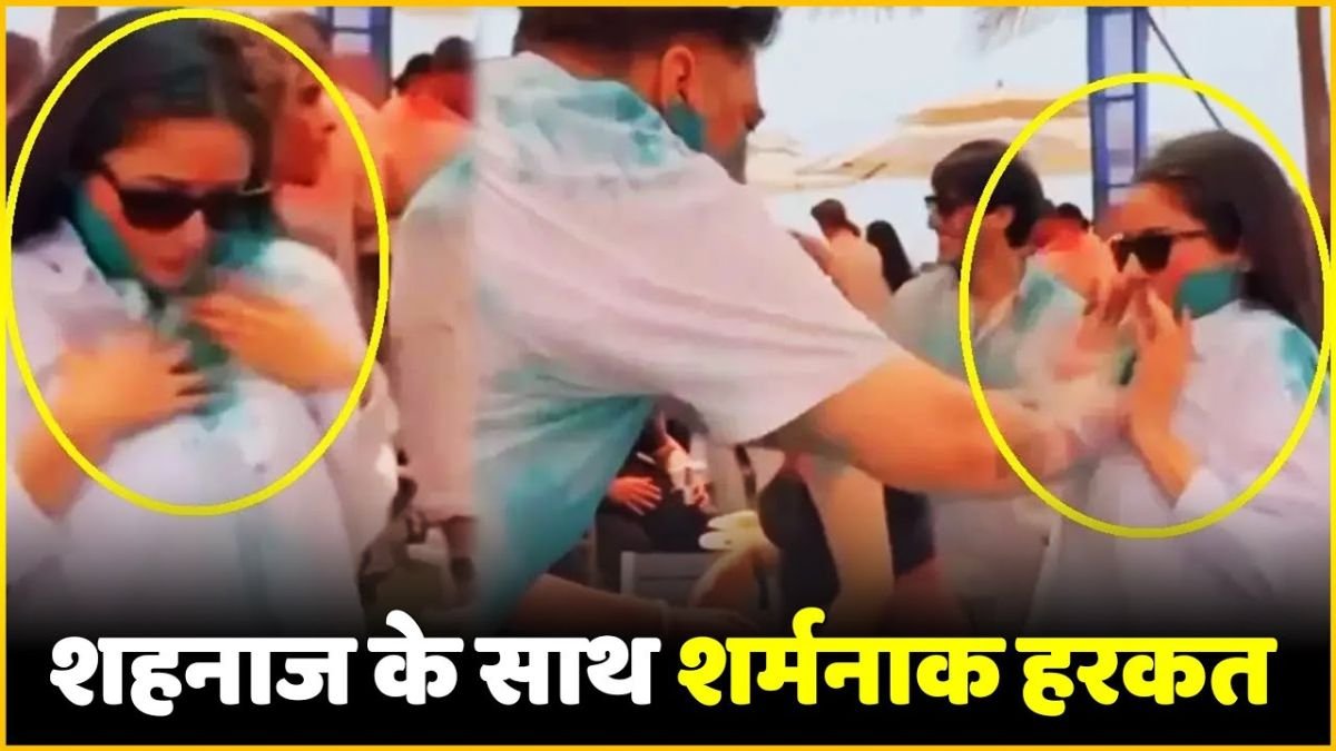 तभी एक लंबा सा आदमी शहनाज गिल के पास आता है और उन्हें गुलाल लगाने की कोशिश करता है शहनाज गिल भी उसे कुछ नहीं कहती और प्यार से गुलाल लगवाती है हालांकि यह आदमी रंग लगाने के बहाने लिमिट क्रॉस कर देता है और गुलाल लगाते लगाते उसके हाथ गाल से नीचे आ जाते हैं शहनाज गिल की शर्ट में भी रंग चला जाता है और एक्ट्रेस बेहद अनकंफर्ट बल हो जाती हैं शहनाज गिल की स्माइल इस हर के बाद डर में बदल जाती है वह घबराहट के साथ पीछे हट जाती है